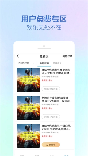 GG租号是一款专门面向游戏玩家打造的账号租赁平台软件,可为用户提供各类热门游戏的账号租赁服务。该平台支持多种游戏类型与租赁时长的选择,并具备账号筛选及安全保障功能,能有效保障租赁过程的安全与可靠,有需求的话就赶紧使用吧!