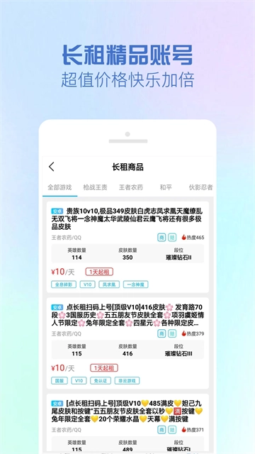 1、全品类游戏覆盖——提供当下热门游戏及火爆新游的账号出租服务;