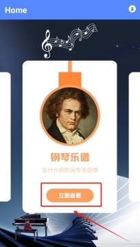 1. 开启软件,于首页即可瞧见“立即查看钢琴乐谱”的按钮,点击该按钮便进入乐谱页面。