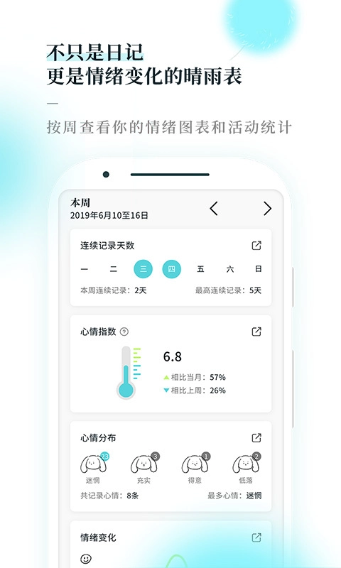 3、自动进行整理,每周查看你的情绪图表以及活动统计,从而发现其中的变化。