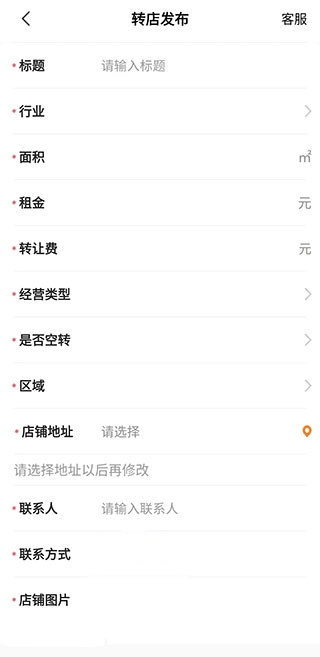 ③ 按照提示填写店铺地址、面积、租金、经营品类、转让原因等关键信息(标*的项目为必填项),上传实景照片,确认提交后就能立即上线——整个过程平均花费的时间不到3分钟。