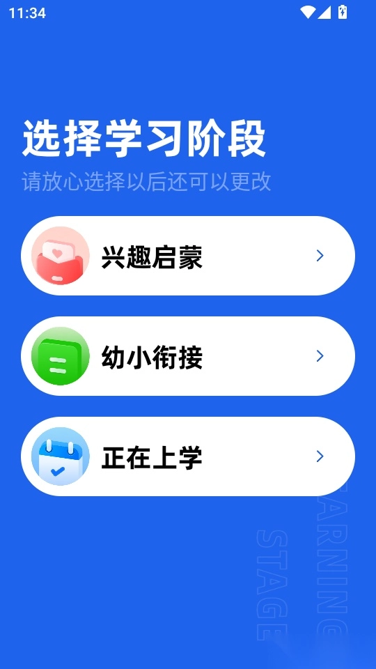 在“选择学习阶段”界面中,点击任意一个按钮功能选项,即可进入后续操作步骤。