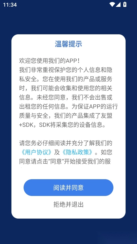 首先打开软件,浏览“温馨提示”内容后,点击“阅读并同意”按钮即可进入。