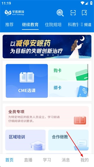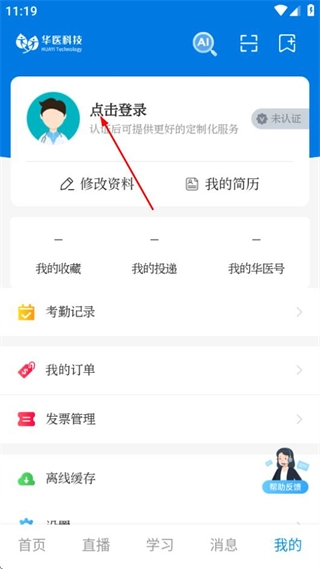 在掌上华医的首页,点击底部的“我的”选项,进入个人中心页面。
