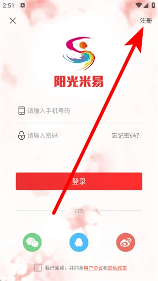在登录页面,点击右上角的注册按钮,即可进入手机注册页面。