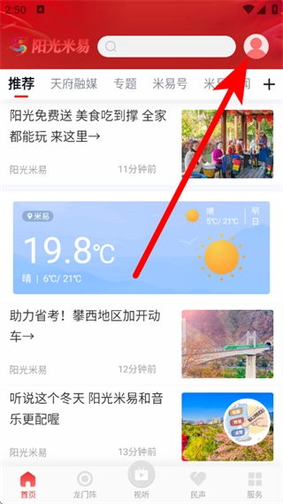 打开阳光米易应用,点击界面右上角的个人图标,即可进入个人中心页面。