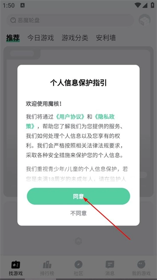 在个人信息保护指引的弹窗里点击同意,即可进入魔核首页。