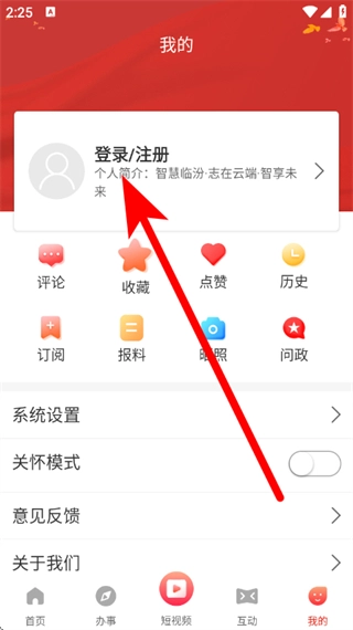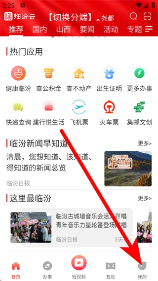 1、打开临汾云,点击底部的我的,进入个人页面。