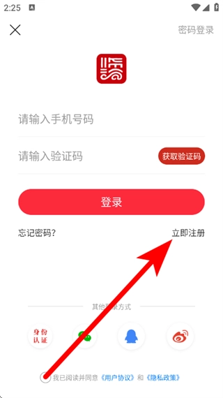 3、在登录页面,点击选择立即注册,进入注册页面。