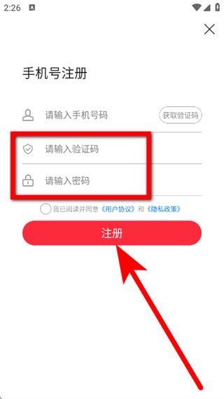 5、输入验证码,设置密码,勾选相关协议后,点击注册按钮,即可完成注册流程。