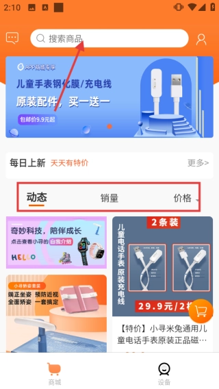3、在【商城】页面,通过顶部【搜索商品】栏输入关键词查找商品,也可依据【动态】【销量】【价格】等标签对商品进行排序,快速筛选心仪商品。