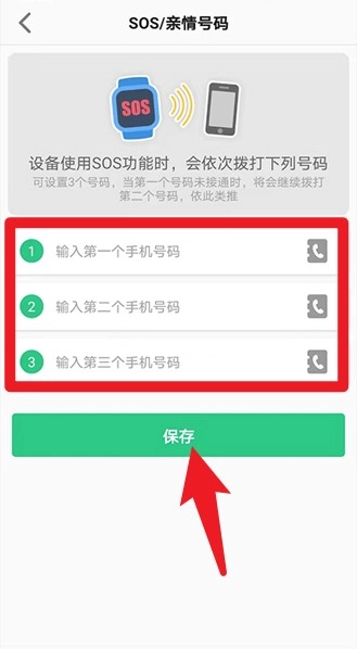 4、进入SOS亲情号码设置页面,依次输入三组号码,当设备处于遇险状态时,会自动按顺序拨打这些号码。