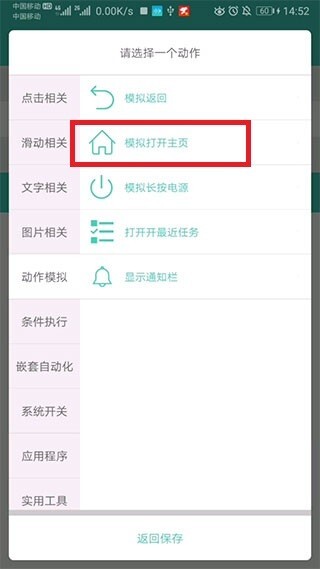 5、点击蓝色的指令标识,在选项中选择动作模拟,接着在动作模拟的相关选项里选择模拟打开主页,此操作即为第一个动作。
