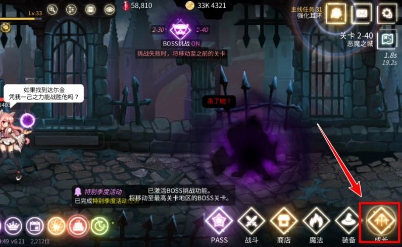 2. 角色等级会呈现在人物下方,当你点击“成长”按钮,就能手动提升角色等级,进而解锁更多技能与能力。