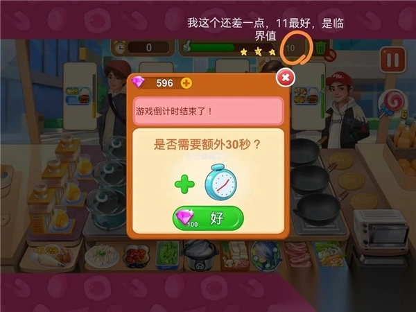 时间一到,若连一颗星都没达到,就能花费100钻延长30秒,多数情况下,延长这30秒时间就足够了。