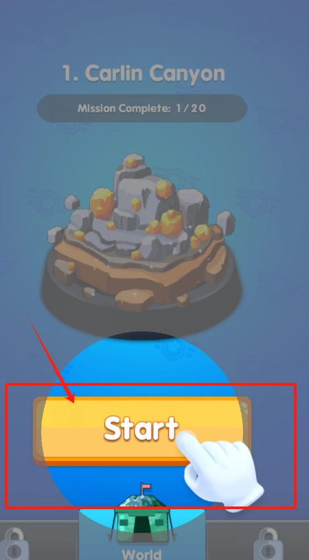 1. 当看到山峰图标与Start按钮时,直接用手指点击黄色的开始键,并且手指要指着它,此时关卡任务显示仅完成了1个。