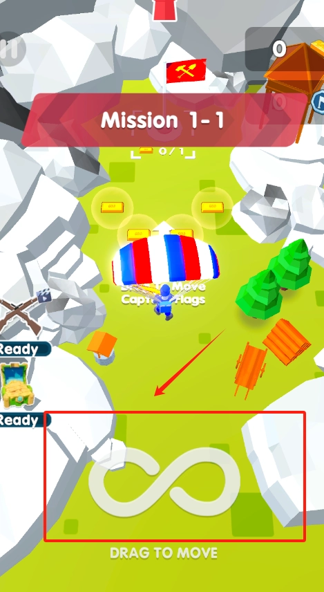 2、屏幕正中央,有个背着降落伞的角色正在下落,屏幕底部的红框内,有一个无限符号图标,只要按住这个图标并拖动,就能操控角色移动位置。