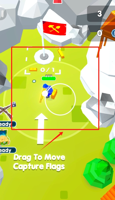 3、身着蓝色衣服的角色位于红色框内,其身旁放置着金色物品。此时,通过按住并拖动该角色,去抢夺旗帜,页面右上角会显示时间以及得分情况。