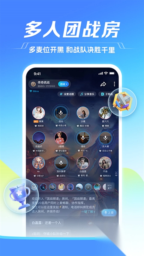TT语音官方正版作为一款社交应用,致力于为用户打造丰富多元的游戏娱乐互动场景。涵盖游戏连麦、队友匹配、玩伴组队、线上KTV、你行你唱、语音交流、直播娱乐以及电子竞技电竞通道等多种形式。只要打开TT语音APP,用户随时随地都能结识到志同道合的玩伴,一同畅享游戏带来的欢乐。