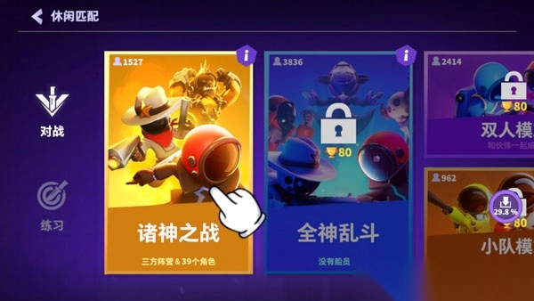 3、调整好后,选择游戏玩法,游戏现有诸神之战、全神乱斗、双人模式、小队模式等玩法;