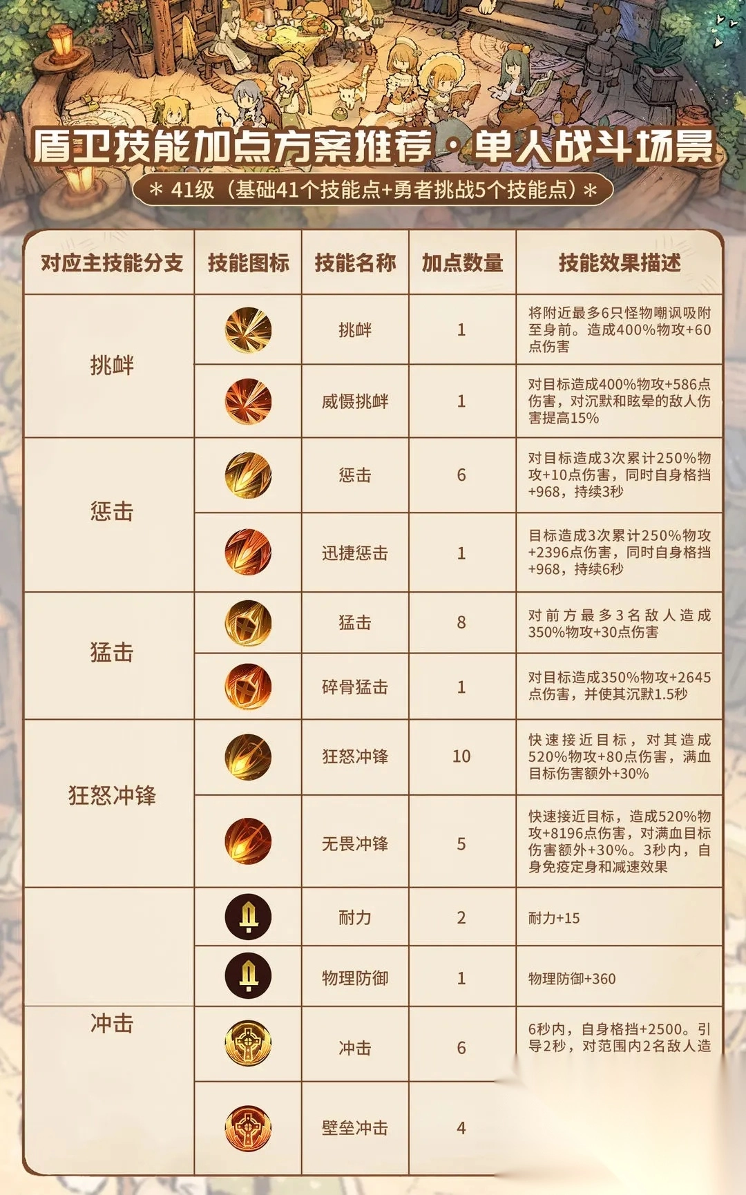 输出方案在单人战斗场景中更为适用,像阿奇古塔、主线剧情、勇者挑战这类玩法(或者在作为大佬助战的时候)。在这类使用场景下,单人需要同时承担承受伤害与输出的职责,所以在技能加点方面,要更侧重于强化输出能力。