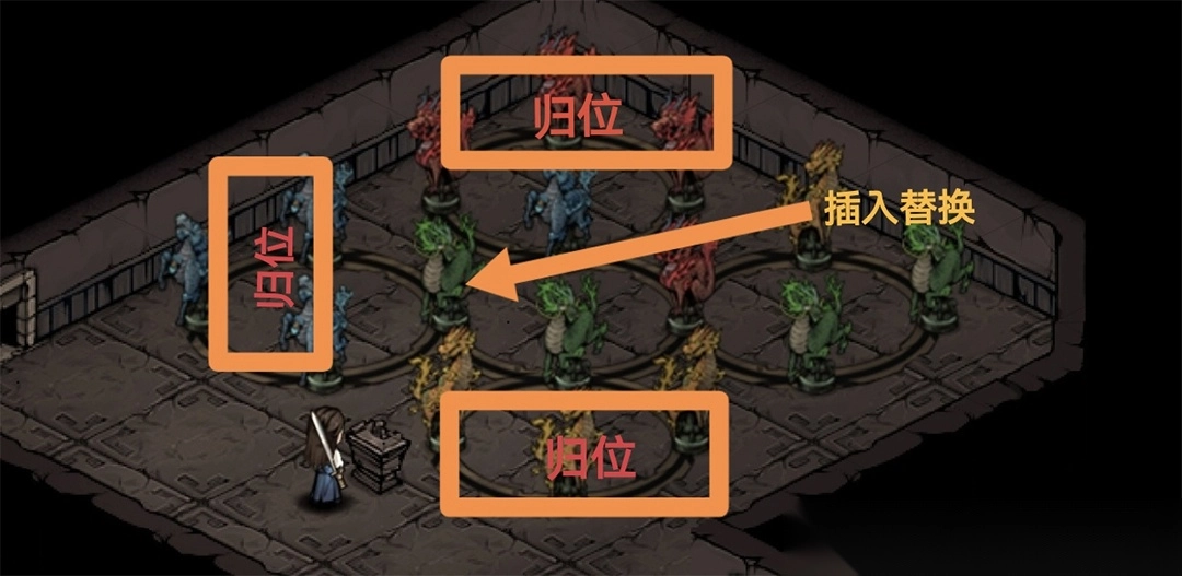 用拉杆把四个雕像全部移动到卡槽上。