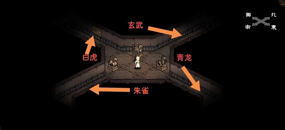 东青龙,西白虎,南朱雀,北玄武,路口会有四座雕像中的三座,看缺少哪座雕像就走哪个方向。