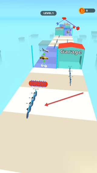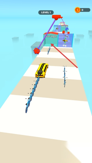 2、合并同色自行车(堆叠),升级成汽车(如黄色车),冲过【Garage】终点。