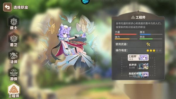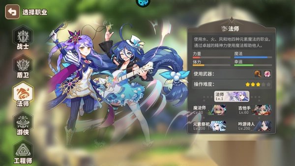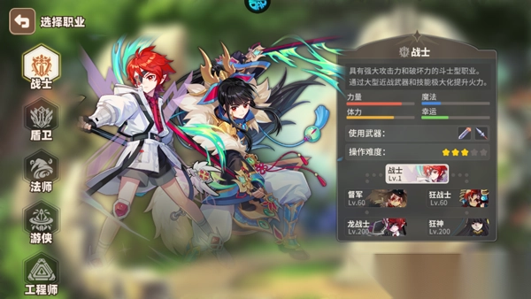 具有强大攻击力和破坏力的战士,以强烈的信仰和防御面对战斗的盾卫,使用水火风地四种元素的法师,喜欢战斗和冒险充满幸运的游侠