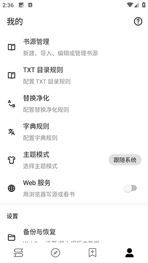 2、如果想要自己导入书源,点击我的界面,点击书源。