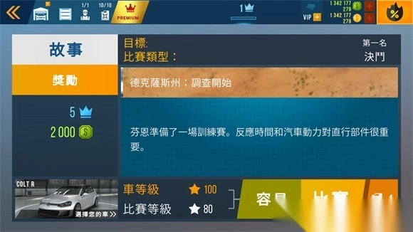 2、完成教程后,进入游戏主界面。在这里,你需要选择一辆初始汽车,开启你的竞速生涯。