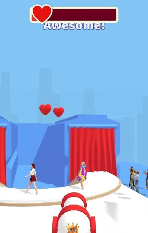 3、抵达终点后,通过左右滑动屏幕,操控大炮进行瞄准与射击,从而为模特们更换服装。