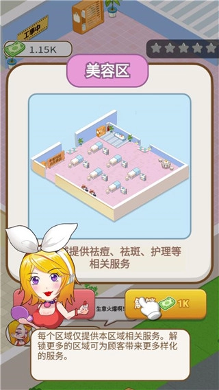 4、点击美容项目,每个区域会有不同的服务,解锁服务后,顾客可以在当前区域享受服务,升级服务能获得更多的现金