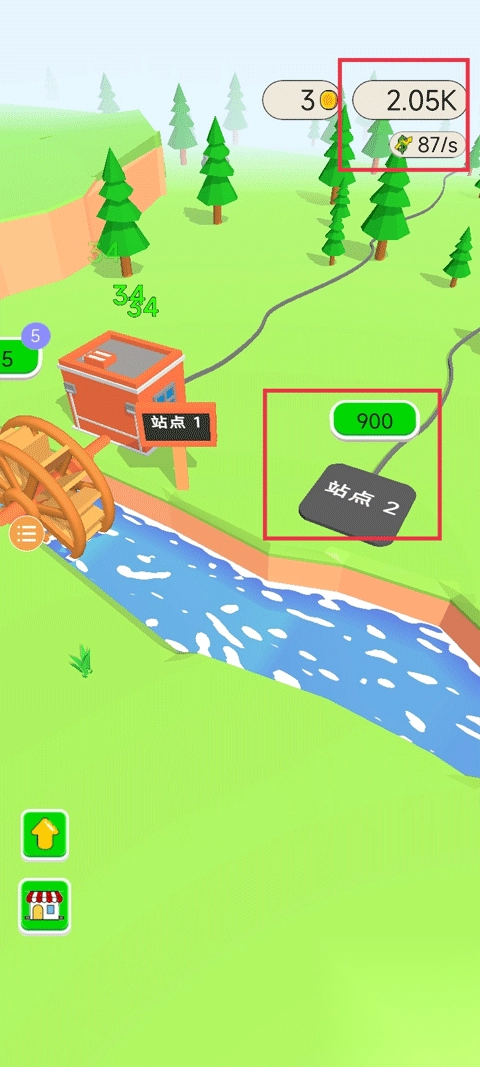 1、打开游戏,首先点击绿色按钮“2”,就能立马建造一个水力发电机。