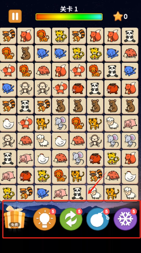 1、点击带动物图案方块,连成直线消除,用道具辅助通关,顶部显示关卡进度。
