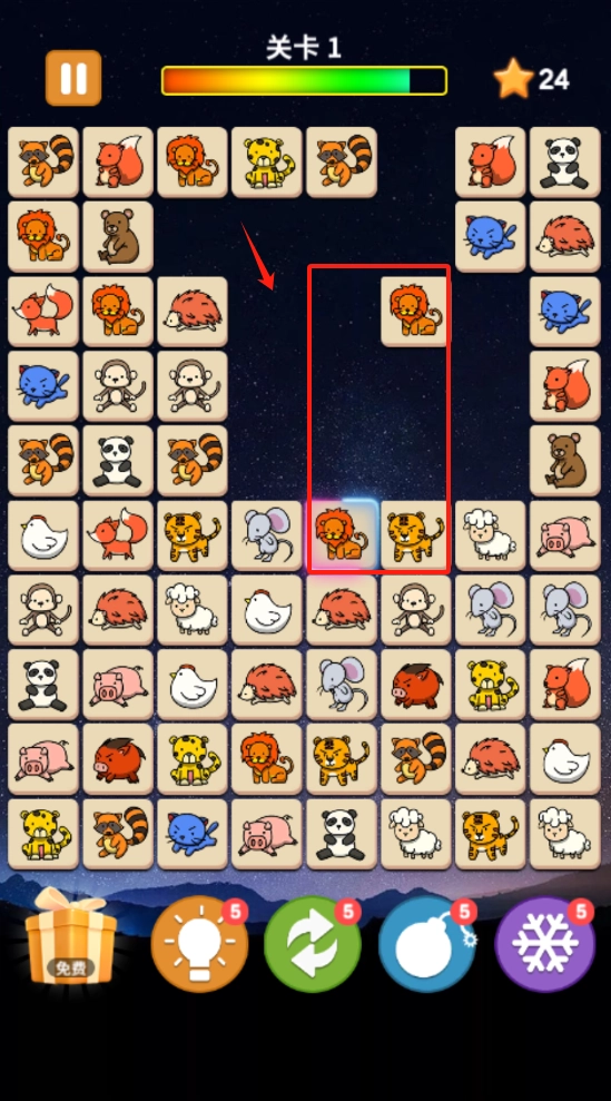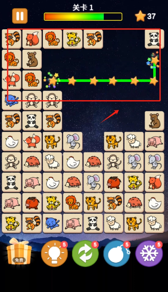 2、选择相邻同动物方块连线消除,底部道具可清除障碍,右上角显示星级进度。