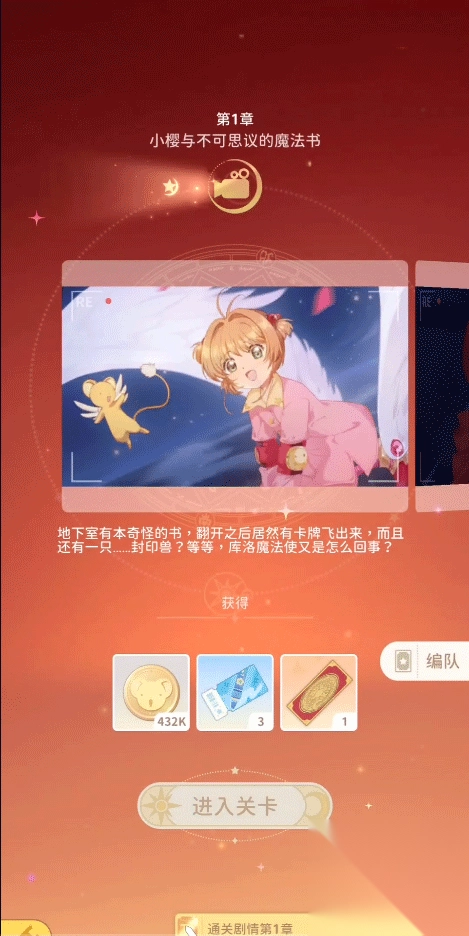 2、点击【进入关卡】,前往第一章“小樱与不可思议的魔法书”。