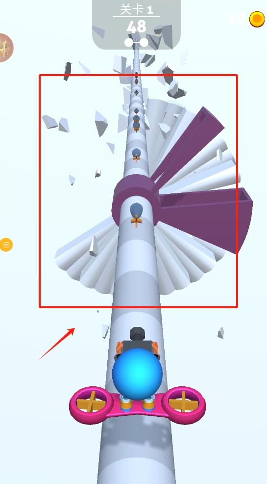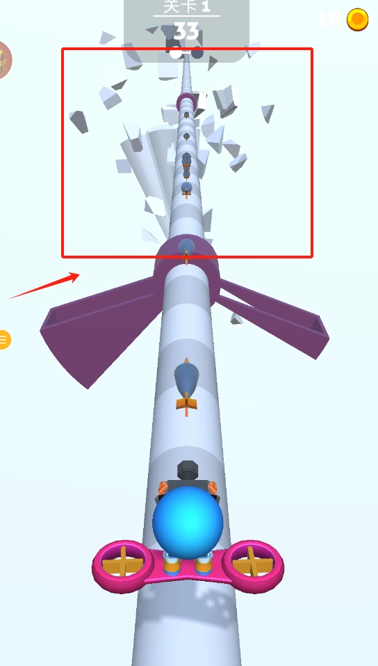 2、操控蓝色球体在粉色滑板上滑行,避开上方飞散碎片,注意关卡和分数。