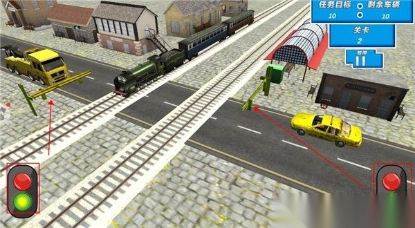 掌握核心控制:界面左右两侧的红绿灯为栏杆控制装置,通过点击它们可灵活操控栏杆升降。