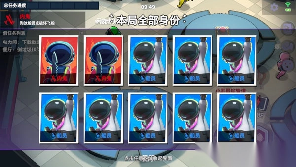 4、每个人将被随机分配一个身份,船员的任务是完成飞船的修理并找出内鬼,而内鬼的任务则是破坏飞船并逐步消灭船员。