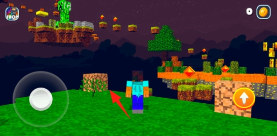 2、踏入绿色草地场景,操控角色挖掘草丛、收集物资,同时关注浮空岛屿,提前规划路径前去探索。