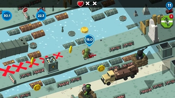 在前进时,会遇到狙击手,只要我们的角色在狙击手视线内移动,就会被其锁定并开枪,也是一枪损失一点生命值,狙击手短时间内不会连续开枪,因此在拆狙击手附近的炸弹时,一定要避开其视线接近,不然时间可能不够拆弹。