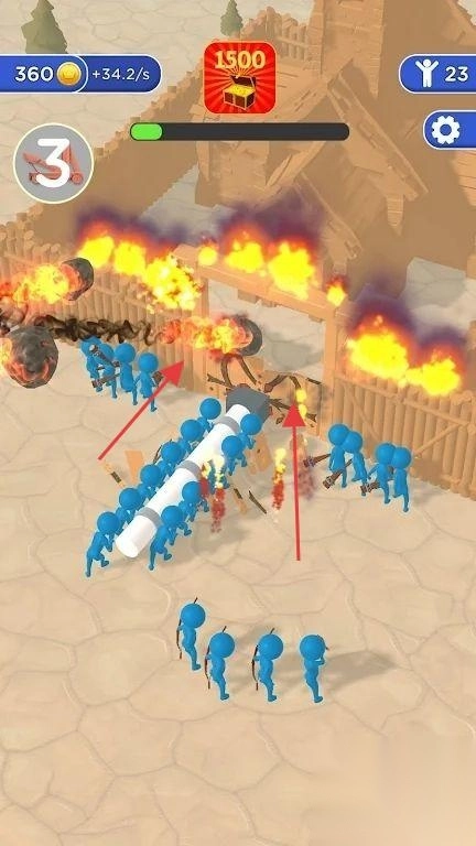 1. 在战斗开始之前,积攒金币(例如360、2.3K ),对火柴人部队展开训练,为攻城作战做好准备,接着点击部队进行部署并发起进攻。