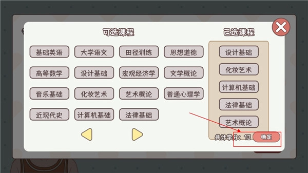 3、每门课程均会增加一个属性,同时降低一个属性。在选课过程中,长按该课程即可查看相关信息。(当然,你也能在后续上课的时候查看,届时会直接展示出来,但那时就不能重新选课了。)