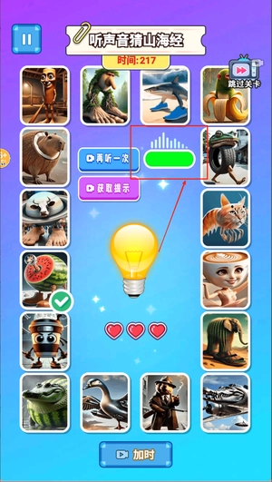 1. 核心机制以“听声识人”为中心展开,每一轮挑战都会播放一个由AI生成的角色声音,玩家需要从多个具有山海经风格的形象里挑选出与之匹配的选项。
