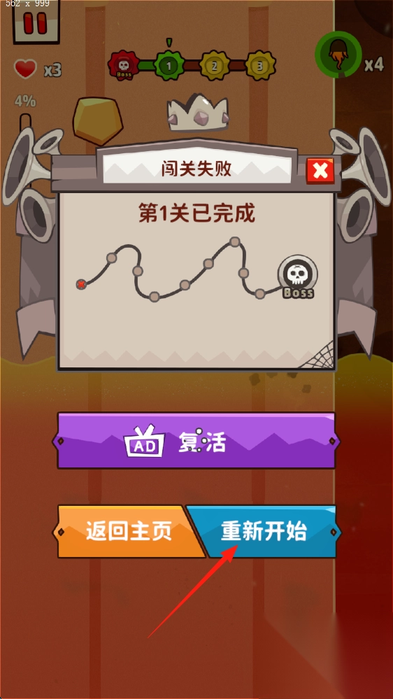 2、闯关失败后,选择重新开始,调整操作,再次挑战,尝试通关。