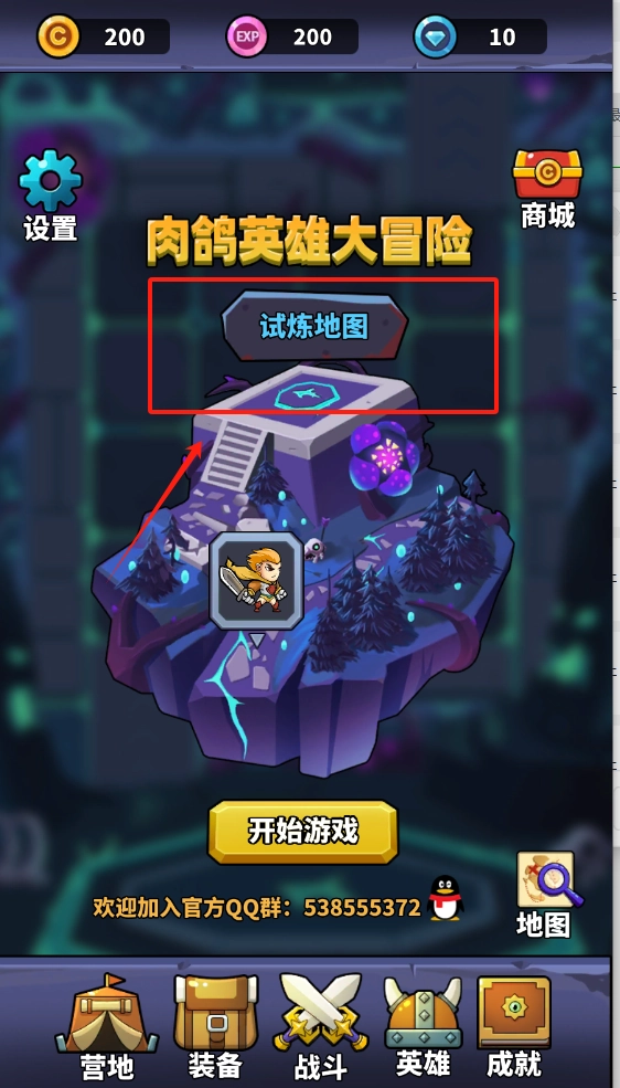 1、点击试炼地图进入战斗,点开始游戏开启冒险,底部功能栏可查看角色与背包。