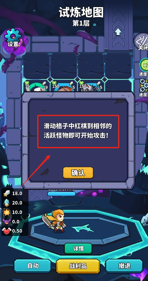 2、滑动红棋靠近怪物触发战斗,点击详情查看角色属性,用撤退放弃当前关卡。