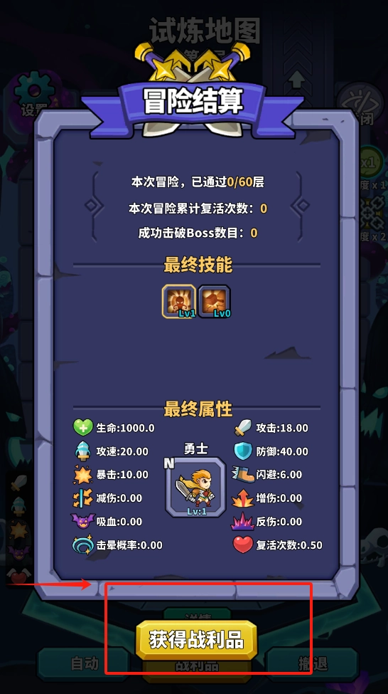 3、结算界面查看技能等级和属性,点获得战利品领取奖励,可撤退返回主城。