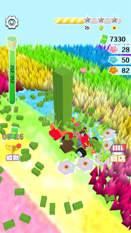 2、以缤纷多彩的视觉效果呈现,运用鲜明活泼的色彩组合与灵动的光影动态,营造出绚烂多姿的割草场景。